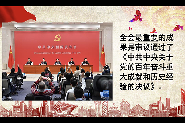 活动主要分享十九届六中全会的主要内容。中国从落后到领先,从贫穷到富裕,经历了艰苦卓绝的奋斗,更倾注了党与人民的血泪。中国复兴的历史,是党带领人民走出的最灿烂最辉煌的史诗。面对现在和未来的困难和挑战,中国共产党更会与群众紧密联系,以习近平领导的党组织也会坚持正确的发展方向,继续建设新时代的伟大工程,成就中华民族的伟大复兴。在分享后,同学们感触很深,踊跃说出自己对中国共产党的赞叹,也描述了关于未来的想象。